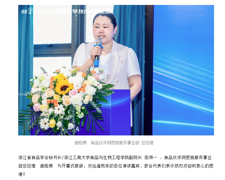 2024年5月15日,由食品伙伴網(wǎng)和浙江省食品學(xué)會(huì)聯(lián)合主辦,全球化學(xué)感官研究聯(lián)盟(GCCR)、湖北省照明學(xué)會(huì)、西安交通大學(xué)第二附屬醫(yī)院、上海盛評(píng)檢測(cè)技術(shù)有限公司協(xié)辦,濟(jì)南智感分析儀器有限公司、煙臺(tái)食邦信息科技有限公司、感知網(wǎng)共同支持的“2024 感官科學(xué)技術(shù)創(chuàng)新論壇”在杭州萬(wàn)信瑞鉑酒店盛大開(kāi)幕!