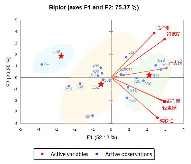 (1)通過感官Q(mào)DA測試,結(jié)合主成分分析與聚類分析,定位該類面膜的主要感官屬性,總結(jié)3類面膜的膚感特征,選出每一類的代表品;