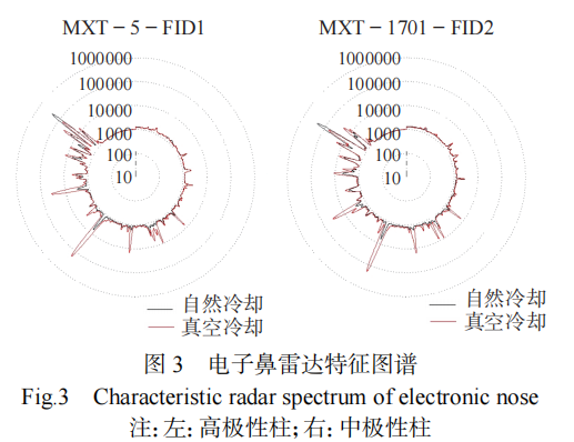 氣相電子鼻檢測條件 本實驗使用全自動超快速氣相色譜電子鼻 Heracles Ⅱ?qū)煞N醬牛肉進行檢測。檢測參數(shù)如表1所示。電子鼻的氣相部分含有兩根平行不同極性的色譜柱,其中,F(xiàn)ID1 是高極性色譜柱,F(xiàn)ID2 是中極性色譜柱。每個樣品重復(fù)3 次。