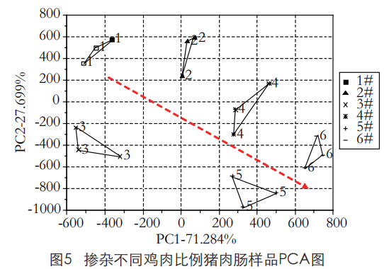 圖5為摻雜不同雞肉比例豬肉腸樣品的主成分分析二維圖。從圖5可見前2個(gè)主成分的貢獻(xiàn)率分別為71.284%、27.699%,累計(jì)貢獻(xiàn)率98.983%,其余主成分貢獻(xiàn)率僅為1.017%,所以取前2個(gè)主成分對應(yīng)的特征向量所決定的兩維子空間就能夠完全反映樣品的整體數(shù)據(jù)信息。同時(shí),從圖5還可以看出,摻雜不同雞肉比例的豬肉腸樣品分別聚類在PCA圖中的不同區(qū)域,所有樣品相互之間能夠較好地區(qū)分,顯著性非常高。聚類區(qū)域分布也呈現(xiàn)出一定的規(guī)律性,隨著摻雜雞肉比例的增加,分布區(qū)域總體按圖中標(biāo)注虛線的方向發(fā)展,即朝PC1增加、PC2下降的方向發(fā)展,同時(shí)不同分布區(qū)域的距離并沒有因?yàn)閾诫s雞肉比例的增加而出現(xiàn)顯著的變化。