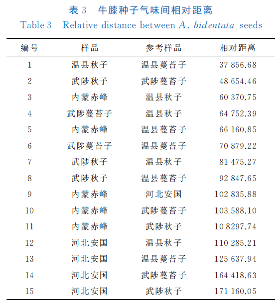 表3為樣品氣味兩兩間相對距離表。樣品間的相對距離越近,則整體氣味越接近,反之亦然。由表3可知,溫縣秋子與溫 縣蔓苔子的相對距離最近(37859.68),其次是武陟秋子與武陟蔓苔子(48654.46),秋子與蔓苔子是牛膝的2種不同繁殖類型的種子,其整體氣味較相近,符合實(shí)際生產(chǎn)規(guī)律。而河北安國與武陟秋子相對距離最遠(yuǎn)(171160.05),即其氣味與武陟秋子差異最大。