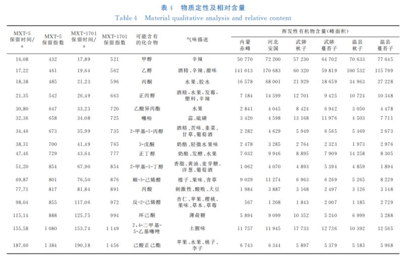 用AroChembase數(shù)據(jù)庫對樣品中的揮發(fā)性化合物進(jìn)行定性分析,其可能含有的化合物如 表 4所 示。由表4可知,不同牛膝種子樣品的揮發(fā)性氣味化合物在含量上存在差異。牛膝種子中揮發(fā)性化合 物etha-nol平均含量最高,峰面積范圍為59819~170;揮發(fā)性化合物(E)-2-hexenal平均含量最低,峰面積范圍為567~1185。武陟秋子和蔓苔子的揮發(fā)性氣味化合物在含量上較為接近,溫縣秋子和蔓苔子的揮發(fā)性氣味化合物在含量上也較為接近,說明秋子與蔓苔子的揮發(fā)性氣味化合物較為相似。不同來源牛膝種子的氣味化合物含量差異較大,證明Heracles Ⅱ超快速氣相電子鼻能夠快速準(zhǔn)確地識(shí)別出不同來源牛膝種子之間的差異,牛膝種子檢測提供了新技術(shù)。