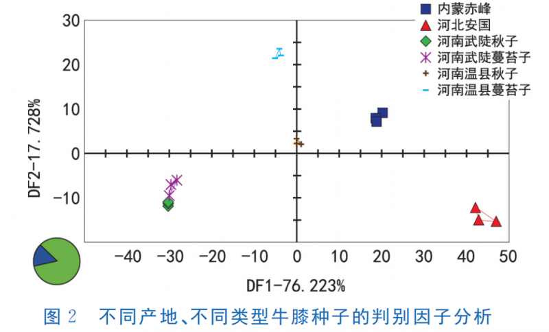 對不同產(chǎn)地、不同類型的牛膝種子進(jìn)行判別因子分析,結(jié)果如圖2所示,6種樣品均能被較好地區(qū)分。武陟秋子與武陟蔓苔子較相近,二者區(qū)分效果較差。