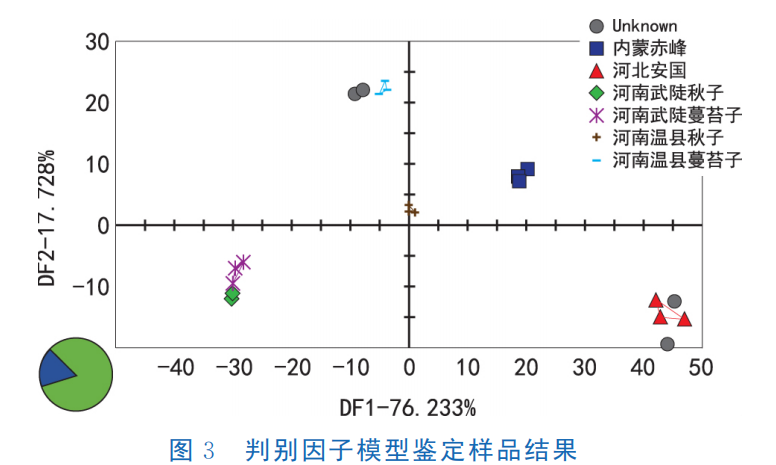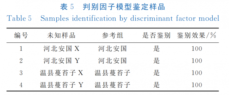 未知樣品分別為屬于河北安國樣品組的河北安國X、河北安國Y及屬于河南溫縣蔓苔子樣品組的河南溫縣蔓苔子X、河南溫縣蔓苔子Y。由此可知判別因子模型為有效模型,可用于不同產(chǎn)地牛膝種子的區(qū)分,使PCA結(jié)果得到進(jìn)一步驗(yàn)證。