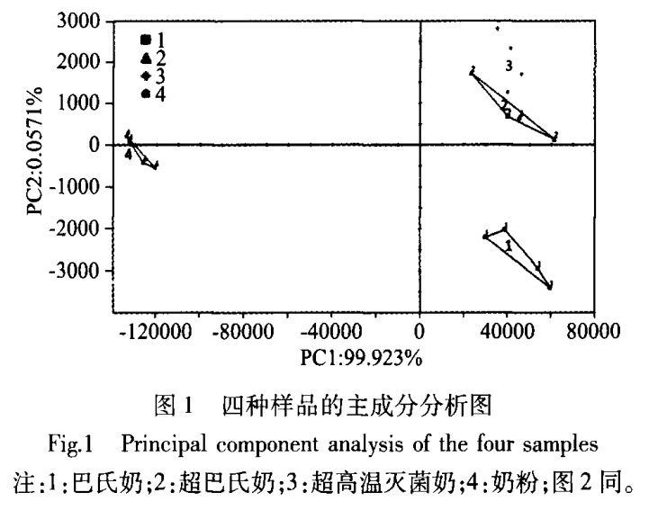 樣品間區(qū)別指數(shù)分析 區(qū)別指數(shù)是基于主成分分析圖中的兩個樣品組簇團之間的相對距離計算而出的,兩個樣品組間簇團距離越大同時樣品組內(nèi)的差異越小,則兩個樣品組的區(qū)別指數(shù)就越接近100%,即區(qū)別指數(shù)越大則表示樣品組間的區(qū)別越大,反之越小。如表2所示,4號奶粉樣品與1號巴氏奶、2號超巴氏奶及3號超高溫滅菌奶的區(qū)別指數(shù)均較大,且與3號超高溫滅菌奶的差異最大。同時,2號超巴氏奶與3號超高溫滅菌奶的區(qū)別指數(shù)最小,則表明差異最小。