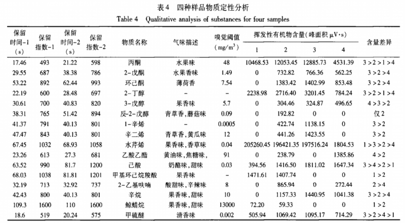 物質(zhì)定性分析 結(jié)合保留指數(shù)和Aro Chem base數(shù)據(jù)庫對特異性化合物進行定性及含量分析,不同加工方式牛奶的氣相色譜圖如圖3所示,可能含有的化合物見表4所示。閾值的大小代表了物質(zhì)氣味的強弱,相同含量的兩種物質(zhì),閾值越低則表示氣味越強烈。在表4物質(zhì)定性中假設各物質(zhì)含量相同的前提下,水介質(zhì)中氣味最強的物質(zhì)是1一辛烯(閾值是5X 10‘4)。同時,由于儀器的檢測器是氫離子火焰檢測器,為質(zhì)量型檢測器,物質(zhì)含量的高低則表現(xiàn)在峰面積大小上,表4中列出了在各個保留時間上的峰面積,并通過峰面積大小對樣品含量的差別進行排序。結(jié)果顯示隨著加工溫度升高,丙酮、2一丁醇、辛二烯、己酸和甲硫醚的含量也隨之增多。同時,甲基環(huán)己烷羧酸、丙酮、2一丁醇和水芹烯在奶粉的加工工藝中出現(xiàn)了大量的損失。甲硫醚是牛乳產(chǎn)品中特有的有機化合物,且其嗅覺閾值較低,氣味強度較高,其含量稍高便會產(chǎn)生異味。如表4所示,甲硫醚在巴氏奶中的含量比在超巴氏和超高溫滅菌奶中的低,因此加工工藝對甲硫醚的含量產(chǎn)生了一定的影響,從而影響了樣品的整體風味。