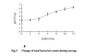 圖三表明,保藏出去菌落總數(shù)變化較小,出現(xiàn)明顯的延滯期,這是由于鱸魚中的微生物剛進入冷環(huán)境,在0℃條件下生長緩慢。第6天菌落總數(shù)較第4天顯著增長,保藏后期總數(shù)繼續(xù)遞增,在貨架期終點時最大。菌落總數(shù)的變化趨勢與TVB-N值檢測結(jié)果基本一致。
