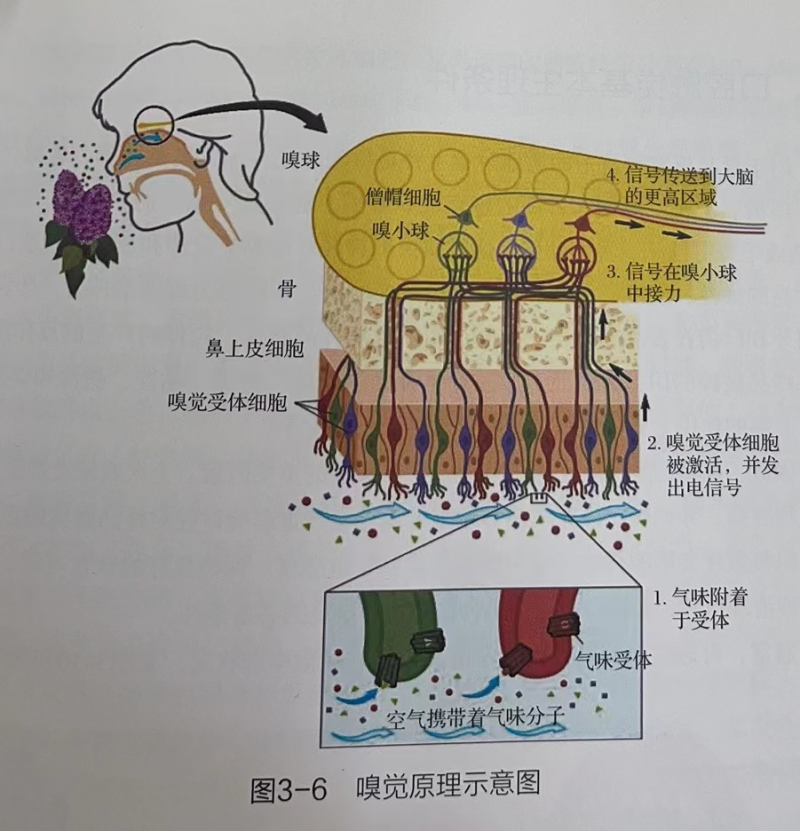 揮發(fā)性氣味物質(zhì)在呼吸作用下進入鼻腔,首先進入嗅感區(qū)吸附和溶解在嗅黏膜表面,與嗅腺細胞的分泌物溶在一起,進而擴散至嗅毛,被嗅細胞所感受,嗅細胞表面電荷改變,Na﹢,K﹢等離子跨膜移動產(chǎn)生電流發(fā)出電信號,通過傳導神經(jīng)以脈沖信號的形式傳遞,神經(jīng)末梢產(chǎn)生興奮信號,經(jīng)過大腦皮層嗅區(qū)信號處理分析后產(chǎn)生嗅覺(圖3-6)。