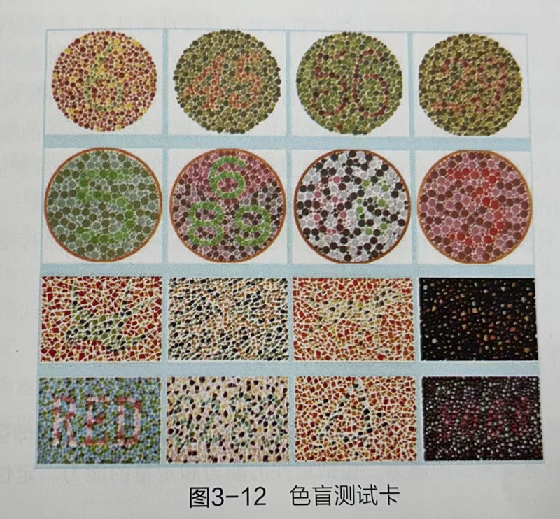 全色盲是色覺障礙中最嚴重的一種,患者喜暗、畏光,表現(xiàn)為晝盲。對于顏色只有明暗之分,而無顏色差別。紅色盲又稱第一色盲,患者主要是不能分辨紅色,對紅色與深綠色、藍色與紫紅色以及紫色不能分辨,常把綠色視為黃色,紫色看成藍色,將綠色和藍色相混視為白色。綠色盲又稱第二色盲,患者不能分辨淡綠色與深紅色、紫色與青藍色、紫紅色與灰色,把綠色視為灰色或暗黑色。臨床上把紅色盲與綠色盲統(tǒng)稱為紅綠色盲,該類患者比較常見。我們平常說的色盲一般就是指紅綠色盲。藍黃色盲又稱第三色盲?;颊咚{黃色混淆不清,對紅、綠色可辨。實踐中,主要采用色盲測試來初篩評價員的視覺條件,色盲測試采用如圖3-12所示的測試卡形式。