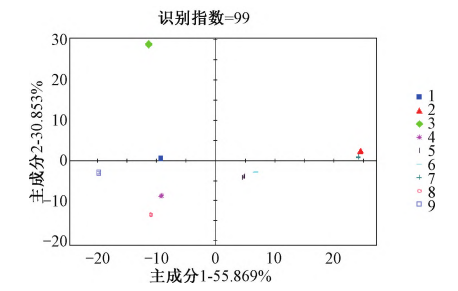 對(duì)懷區(qū)9種樣品進(jìn)行電子眼的PCA分析,由圖1可知,第一主成分(PC1)與第二主成分(PC2)之和達(dá)到了86.722%,代表了樣品絕大部分信息,其識(shí)別指數(shù)為99,識(shí)別指數(shù)框?yàn)榫G色,說(shuō)明各個(gè)樣品之間在顏色上存在差異。在主成分分析圖中,樣品間的相對(duì)距離越近,則樣品整體顏色越接近。“金九”與“85?5”樣品間的相對(duì)距離最近,顏色最相近;“噸王”和“懷豐”分別分布在單獨(dú)的區(qū)域且與其他品種相對(duì)距離較遠(yuǎn),顏色差別較大。各樣品整體顏色差異較大,使用電子眼能迅速區(qū)分懷區(qū)不同主栽品種生地黃。
