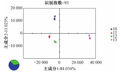 采用Alpha soft軟件對(duì)所得數(shù)據(jù)進(jìn)行分析,利用主成分分析(PCA)法,通過(guò)對(duì)原始數(shù)據(jù)向量進(jìn)行線性變換,對(duì)多個(gè)數(shù)據(jù)進(jìn)行降維處理,轉(zhuǎn)化為少數(shù)綜合指標(biāo)。
