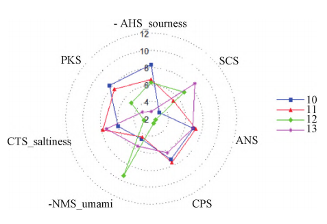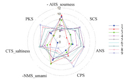 圖8 不同產(chǎn)地“北京3號(hào)”生地黃滋味雷達(dá)圖