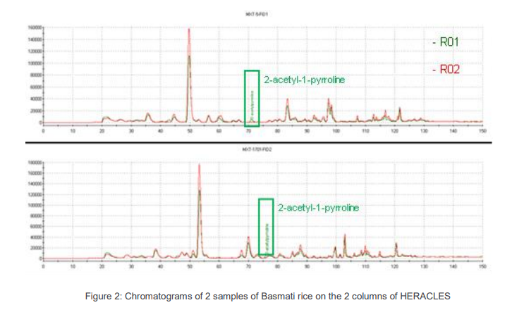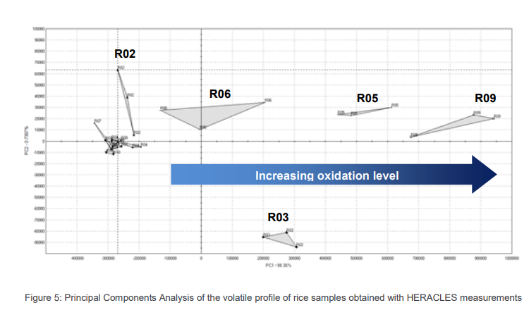 本研究表明,Heracles主成分分析可以在采集完樣品之后直接區(qū)分大米的氣味差異,同時此次實驗還成功地用于快速比較幾種大米樣品中2-乙?;?1-吡咯啉的含量,以及氧化指標(biāo)(己醛)的含量。