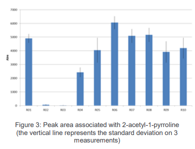 比較其己醛的含量可知大米的氧化水平,比較2-乙?;?1-吡咯啉含量可知其特征香味在大米中的含量。