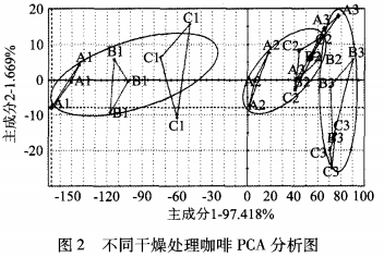 PCA 分 析 能 較 好 的 區(qū) 分 樣 品 ,主 成 分 1的 貢 獻(xiàn) 率 高 達(dá) 97.418% ,主 成 分 2的 貢 獻(xiàn) 率 為 1.669% 。三 組 實(shí) 驗(yàn) 均 能 較 好 區(qū)分 樣 品 ,且 樣 品 2與 樣 品 3之 間 的距 離 遠(yuǎn) 小 于 樣 品 1與 樣 品 3之 間 的 距 離 ,說(shuō) 明 熱 風(fēng) 干 燥 會(huì) 造 成 咖 啡 風(fēng) 味 變 化 ,其 與 太 陽(yáng) 光 自然 風(fēng) 味 相 差 較 遠(yuǎn) ,半 熱 風(fēng) 干 燥 半 自然 干 燥 雖 也 會(huì) 造 成 風(fēng) 味 變 化 ,但 與 太 陽(yáng) 光 自然 干 燥 風(fēng) 味 相 差 不 大 。說(shuō) 明 半 熱 風(fēng) 干 燥 半 自然 干 燥 是 咖 啡 在 惡 劣 環(huán) 境 下 ,咖 啡 濕 豆 干 燥 有 效 的 補(bǔ) 充 。