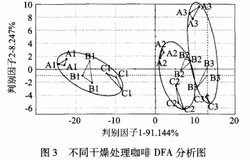 電 子 舌 能 夠 較 好 的 區(qū) 分 不 同 干 燥 處 理 方 式 的 咖 啡 ,主 成 分 1的 貢 獻(xiàn) 率 及 判 別 因 子 1的 貢 獻(xiàn) 率 , 均 達(dá) 到 90% 以 上 ,PCA 分 析 與 DFA 分 析 證 明 結(jié) 論 一致 ,說(shuō) 明 兩 種 分 析 方 式 對(duì) 咖 啡 樣 品 均 具 有 良 好 的 區(qū)分 。