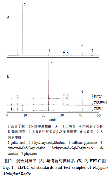 2.2.2 對(duì)照品溶液的制備 精密稱定沒(méi)食子酸、5-羥甲基糠醛、二苯乙烯苷、大黃素-8-O-β-D-葡萄糖苷、大黃素甲醚-8-O-β-D-葡萄糖苷、大黃素、大黃素甲醚對(duì)照品各適量,分別加80%甲醇制成質(zhì)量濃度分別為57.6、68.4、625.0、50.2、8.6、180.0、0.216 μg/mL的對(duì)照品溶液,即得。 2.2.3 供試品溶液的制備 取何首烏飲片粉末(過(guò)40目篩)約1 g,精密稱定,置平底燒瓶中,精密加入80%甲醇25 mL,密塞,稱定質(zhì)量,加熱回流提取30 min,放冷,密塞,再稱定質(zhì)量,用80%甲醇補(bǔ)足減失的質(zhì)量,搖勻,經(jīng)微孔濾膜(0.45 μm)濾過(guò),即得。 2.2.4 線性關(guān)系考察 分別精密吸取對(duì)照品溶液1、5、10、15、20、25 μL,注入液相色譜儀,按“2.2.1”項(xiàng)下色譜條件測(cè)定,以對(duì)照品質(zhì)量濃度為橫坐標(biāo)(X),峰面積為縱坐標(biāo)(Y)繪制標(biāo)準(zhǔn)曲線,并計(jì)算得到回歸方程與線性范圍,結(jié)果分別為沒(méi)食子酸Y=28 655.693 5 X-3 449.895 2,R2=1.000 0,線性范圍5.76~144.00 mg/L;5-羥甲基糠醛Y=78 294.955 3 X+11 679.404 8,R2=1.000 0,線性范圍6.84~171.00 mg/L;二苯乙烯苷Y=16 640.258 1 X+12 599.471 0,R2=0.999 9,線性范圍62.50~1 562.50 mg/L;大黃素-8-O-β-D-葡萄糖苷Y=30 743.247 5 X-9 558.630 6,R2=0.999 9,線性范圍5.02~125.50 mg/L;大黃素甲醚-8-O-β-D-葡萄糖苷Y=27 693.578 4 X-241.880 6,R2=1.000 0,線性范圍0.86~21.50 mg/L;大黃素Y=34 965.433 1 X-22 341.082 3,R2=0.999 9,線性范圍18.00~450.00 mg/L;大黃素甲醚Y=37 991.286 3 X+8 456.727 4,R2=1.000 0,線性范圍21.60~540.00 mg/L;結(jié)果表明,各對(duì)照品在各自范圍內(nèi)線性關(guān)系良好。 2.2.5 精密度試驗(yàn) 精密吸取供試品溶液(ZSW-1)10 μL,重復(fù)進(jìn)樣6次,按“2.2.1”項(xiàng)下色譜條件測(cè)定,6次測(cè)定結(jié)果顯示,沒(méi)食子酸、5-羥甲基糠醛、二苯乙烯苷、大黃素-8-O-β-D-葡萄糖苷、大黃素甲醚-8-O-β-D-葡萄糖苷、大黃素、大黃素甲醚峰面積的RSD分別為0.17%、0.39%、0.31%、0.54%、1.64%、0.21%、0.63%,表明儀器精密度良好。 2.2.6 穩(wěn)定性試驗(yàn) 精密吸取供試品溶液(ZSW-1)10 μL,分別于制備后0、2、4、8、12、24 h進(jìn)樣共6次,按“2.2.1”項(xiàng)下色譜條件測(cè)定,結(jié)果沒(méi)食子酸、5-羥甲基糠醛、二苯乙烯苷、大黃素-8-O-β-D-葡萄糖苷、大黃素甲醚-8-O-β-D-葡萄糖苷、大黃素、大黃素甲醚峰面積的RSD分別為0.52%、0.82%、0.36%、1.38%、1.54%、0.39%、0.90%,表明供試品溶液在24 h內(nèi)保持穩(wěn)定。 2.2.7 重復(fù)性試驗(yàn) 取制何首烏粉末(ZSW-1)約1 g,精密稱定,共6份,按“2.2.3”項(xiàng)下方法制備供試品溶液,分別精密吸取10 μL,注入液相色譜儀,按“2.2.1”項(xiàng)下色譜條件測(cè)定,記錄峰面積并計(jì)算各成分含量,結(jié)果沒(méi)食子酸、5-羥甲基糠醛、二苯乙烯苷、大黃素-8-O-β-D-葡萄糖苷、大黃素甲醚-8-O-β-D-葡萄糖苷、大黃素、大黃素甲醚含量的RSD分別為0.33%、0.92%、0.08%、1.65%、1.67%、1.59%、1.90%,表明該方法重復(fù)性良好。 2.2.8 加樣回收率試驗(yàn) 精密稱定已測(cè)定指標(biāo)成分含量的何首烏粉末(ZSW-1)約0.5 g,共6份,置平底燒瓶中,分別加入對(duì)照品適量,按“2.2.3”項(xiàng)下方法制備供試品溶液。精密吸取上述樣品與對(duì)照品溶液各10 μL,注入液相色譜儀,按“2.2.1”項(xiàng)下色譜條件進(jìn)行測(cè)定,記錄峰面積并計(jì)算加樣回收率,沒(méi)食子酸、5-羥甲基糠醛、二苯乙烯苷、大黃素-8-O-β-D-葡萄糖苷、大黃素甲醚-8-O-β-D-葡萄糖苷、大黃素、大黃素甲醚的平均加樣回收率分別為98.88%、97.99%、97.32%、102.85%、108.12%、96.67%、99.33%,RSD分別為0.36%、0.74%、0.33%、0.74%、0.93%、0.43%、1.16%,均符合《中國(guó)藥典》2020年版規(guī)定標(biāo)準(zhǔn)。 2.2.9 樣品測(cè)定 分別稱取生何首烏、九蒸九曬何首烏、藥典法制何首烏飲片適量,按“2.2.3”項(xiàng)下方法制備供試品溶液,每個(gè)樣品平行2次,按“2.2.1”項(xiàng)下色譜條件進(jìn)行測(cè)定,記錄峰面積并計(jì)算各成分含量,結(jié)果見(jiàn)表1。含量測(cè)定結(jié)果表明,何首烏不同飲片中均含有沒(méi)食子酸、二苯乙烯苷、大黃素-8-O-β-D-葡萄糖苷、大黃素甲醚-8-O-β-D-葡萄糖苷、大黃素、大黃素甲醚6種成分,但不同飲片間各成分含量存在一定差異。九蒸九曬、藥典法制何首烏中沒(méi)食子酸及蒽醌苷元類(lèi)成分的含量與生何首烏相比,均有不同程度的增加,其中以沒(méi)食子酸含量增加最為顯著,藥典法制何首烏約為生品的3倍,九蒸九曬何首烏約為生品的2倍。炮制為制何首烏后,苷類(lèi)(二苯乙烯苷、蒽醌苷)成分含量顯著減少,與生何首烏相比,九蒸九曬何首烏中二苯乙烯苷含量減少了約44%,蒽醌苷類(lèi)成分含量減少了約41%;藥典法制何首烏中二苯乙烯苷含量減少了約69%,蒽醌苷類(lèi)成分含量減少了約85%;而5-羥甲基糠醛僅在藥典法制何首烏飲片中檢出,平均質(zhì)量分?jǐn)?shù)為0.506 1 mg/g。
