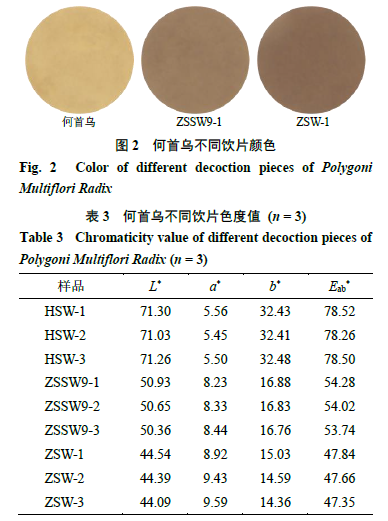 2.3.1 視覺(jué)分析儀參數(shù)設(shè)置及供試品前處理 開(kāi)啟IRIS視覺(jué)分析儀,預(yù)熱15 min,待指示燈顯示綠燈后,校準(zhǔn)儀器鏡頭的曝光度和焦距,使用24色色彩校正板對(duì)儀器進(jìn)行校準(zhǔn)。校準(zhǔn)完成后設(shè)置照明模式為頂部及底部照明,拍照模式為單一快照。取適量何首烏供試品粉末(過(guò)40目篩)于扁形稱量瓶中,壓平,置于儀器測(cè)量白板上,變換位置,平行拍照3次,記錄樣品粉末色號(hào)及比例,計(jì)算樣品色度空間參數(shù)L*、a*、b*值、樣品色度值(Eab*值)及各樣品間的ΔEab值。 2.3.2何首烏不同飲片顏色比較 觀察各樣品顏色,可見(jiàn)何首烏不同飲片顏色差異明顯,結(jié)果見(jiàn)圖2。何首烏不同飲片樣品色度值比較見(jiàn)表3。經(jīng)電子眼測(cè)定,九蒸九曬何首烏與生何首烏的ΔEab>6.0,顏色色差感覺(jué)很明顯,兩者ΔL*為負(fù),Δa*為正,Δb*為負(fù);藥典法制何首烏與生何首烏的ΔEab>6.0,顏色色差感覺(jué)很明顯,兩者ΔL*為負(fù),Δa*為正,Δb*為負(fù),說(shuō)明經(jīng)九蒸九曬及藥典法炮制后何首烏飲片顏色均變深變紅變藍(lán);藥典法制何首烏與九蒸九曬何首烏的ΔL*為負(fù),Δa*為正,Δb*為負(fù),說(shuō)明藥典法制何首烏飲片較九蒸九曬何首烏飲片顏色變化程度更深。