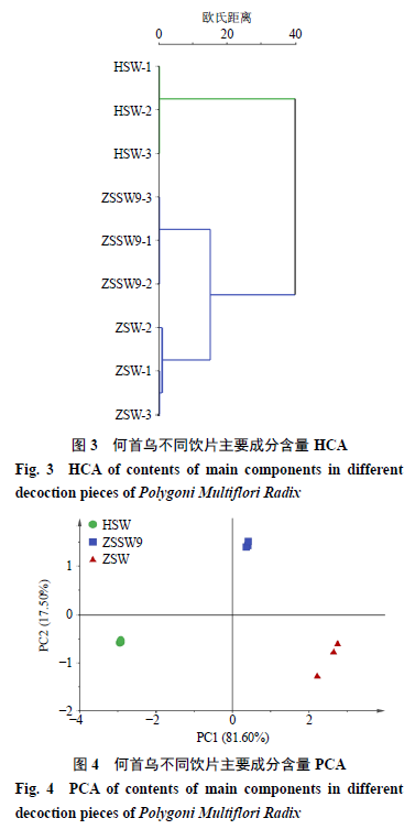 2.4 數(shù)據(jù)分析 2.4.1 含量測(cè)定數(shù)據(jù)分析 將何首烏不同飲片主要成分含量數(shù)據(jù)導(dǎo)入SIMCA 14.1進(jìn)行系統(tǒng)聚類(lèi)分析(hierarchical cluster analysis,HCA)與無(wú)監(jiān)督的主成分分析(principal component analysis,PCA),觀察何首烏不同飲片間聚類(lèi)與自然聚集,結(jié)果見(jiàn)圖3、4。HCA結(jié)果顯示,何首烏不同飲片可各自聚類(lèi),當(dāng)分類(lèi)距離大于15時(shí),3種飲片聚為2類(lèi),生何首烏聚為一類(lèi),九蒸九曬何首烏與藥典法制何首烏聚為一類(lèi)。PCA結(jié)果顯示,PC1和PC2的貢獻(xiàn)率分別為81.60%和17.50%,累積貢獻(xiàn)率達(dá)99.10%,說(shuō)明該數(shù)據(jù)能較好反應(yīng)何首烏不同飲片的整體信息。何首烏不同飲片各自聚集,可分為3類(lèi),生何首烏集中分布在III象限,九蒸九曬何首烏集中分布在I象限,藥典法制何首烏集中分布在IV象限。