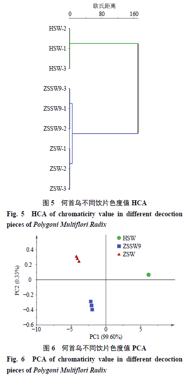 2.4.2 電子眼測(cè)定數(shù)據(jù)分析 將何首烏不同飲片色度值數(shù)據(jù)導(dǎo)入SIMCA 14.1進(jìn)行HCA與PCA,觀察何首烏不同飲片間聚類(lèi)與自然聚集,結(jié)果見(jiàn)圖5、6。HCA結(jié)果顯示,何首烏不同飲片可各自聚類(lèi),當(dāng)分類(lèi)距離為10時(shí),3種飲片聚為2類(lèi),生何首烏聚為一類(lèi),九蒸九曬何首烏與藥典法制何首烏聚為一類(lèi)。PCA結(jié)果顯示,PC1和PC2的貢獻(xiàn)率分別為99.60%和0.33%,累積貢獻(xiàn)率達(dá)99.93%,說(shuō)明該數(shù)據(jù)能較好反映何烏不同飲片的整體信息。何首烏不同飲片各自聚集,可分為3類(lèi),生何首烏集中分布在I象限,九蒸九曬何首烏集中分布在III象限,藥典法制何首烏集中分布在II象限。