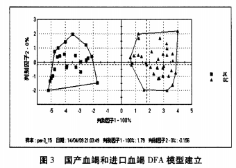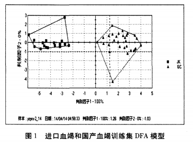 DFA判別結(jié)果如圖3。結(jié)果表明:DFA判別模型能夠很好的區(qū)分國產(chǎn)血竭和進口血竭樣對進口血竭與國產(chǎn)血竭的鑒別具有一定的研究意義 。