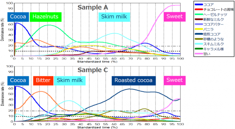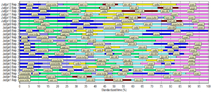 TDS品評法 旨在收集受試者在品嘗產品期間感知到的主要感覺的序列。例如,在品嘗一塊巧克力時,從攝入到吞咽,品評人員可以依次感知可可、可可脂、榛子可可和甜味等屬性作為主導感覺。