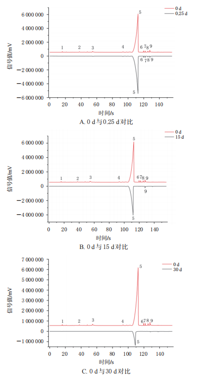 圖3 不同放置時間成人型香囊的疊加色譜圖