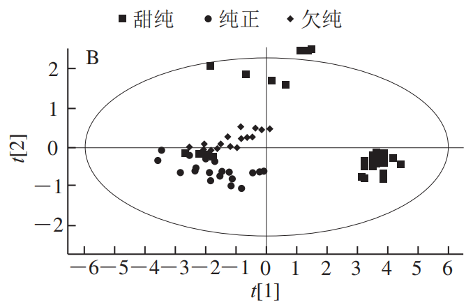根據(jù)專家人工感官審評,將茶湯滋味定義為“甜純”、“純正”和“欠純”3 類進(jìn)行后續(xù)分析。“甜純”定義為茶湯優(yōu)勢滋味屬性為甜純、有回甘或甘和。“純正”滋味則指味道純正、無明顯雜味。“欠純”滋味定義為含有明顯的陳、酸、澀或悶味等不愉快的滋味。根據(jù)茶湯滋味特點(diǎn)的差異,將實(shí)驗(yàn)集16 個工夫紅茶分類。其中甜純組、純正組和欠純組分別包含7、5 個和4 個茶樣(表1)。