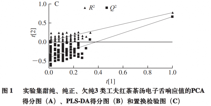 為探索電子舌檢測能否用于工夫紅茶茶湯滋味的判別,以電子舌7 個傳感器響應(yīng)值為X變量,以茶湯滋味分組(甜純、純正、欠純)為Y變量做PLS-DA。PLS-DA是一種有監(jiān)督的模式識別方法,相對于PCA所得的投影通??色@得更好的分類效果。如圖1B所示,3 類(甜純、純正、純)茶湯的聚類結(jié)果類似于PCA的結(jié)果(R2x =1,R2Y =0.61,Q2 =0.512)。Q2 大于0.5,表明模型具有較好的預(yù)測能力。過擬合是PLS-DA模型的一個常見問題。為進(jìn)一步驗(yàn)證PLS-DA模型的可靠性,對該模型進(jìn)行置換檢驗(yàn)驗(yàn)證(圖1C)。將模型建立時定義的Y矩陣的變量隨機(jī)排列100 次,得到R2和Q2 截距分別為(0.0,0.029)和(0.0,-0.399),表明PLS-DA模型穩(wěn)定可靠,未存在過擬合,可用于不同滋味的判別。