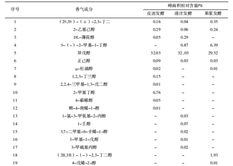 主成分分析可知,主成分為兩類香氣,一類香氣在皮渣發(fā)酵酒和果漿發(fā)酵酒中基本一致,主要為縮醛、丁二酸二乙酯、3-羥基-2-丁酮,相比于果漿發(fā)酵,皮渣發(fā)酵酒的縮醛成分更高;清汁發(fā)酵酒的主要香氣成分為乙酸異戊酯、2-糠酸乙酯、乳酸乙酯。二類香氣在皮渣發(fā)酵酒中種類最多、含量最高,主要為2-甲基丁醇,清汁發(fā)酵和果漿發(fā)酵酒的香氣成分種類相同,主要成分為S-(-)-2-甲基-1-丁醇,但其在果漿發(fā)酵酒中含量遠(yuǎn)高于清汁發(fā)酵。 一類香氣在皮渣發(fā)酵酒和果漿發(fā)酵酒中的含量分別為16.37%和11.99%,且種類相近,而清汁發(fā)酵酒香氣物質(zhì)含量為22.49%。因此,一類主成分在皮渣發(fā)酵酒和果漿發(fā)酵酒中基本相同,和清汁發(fā)酵酒對比明顯。二類香氣在皮渣發(fā)酵酒和果漿發(fā)酵酒中的含量分別為8.06%和6.59%,在清汁發(fā)酵酒中的含量僅為0.97%,對比結(jié)果與一類主成分類似。 如表6所示,一類香氣在皮渣發(fā)酵、清汁發(fā)酵、果漿發(fā)酵酒中體積占比分別為16.37%、22.49%和11.99%,其中皮渣發(fā)酵縮醛占比12.43%,丁二酸二乙脂占比1.18%;清汁發(fā)酵乙酸異戊酯占比12.43%,2-糠酸乙酯占比6.76%;果漿發(fā)酵縮醛占比7.85%,丁二酸二乙脂占比1.39%。二類香氣在皮渣發(fā)酵、清汁發(fā)酵、果漿發(fā)酵酒中體積占比分別為8.06%、0.97%和6.59%。其中皮渣發(fā)酵2-甲基丁醇占比6.76%,清汁發(fā)酵S-(-)-2-甲基-1-丁醇占比0.87%,果漿發(fā)酵S-(-)-2-甲基-1-丁醇占比6.39%。通過對比成分一和成分二得知,皮渣發(fā)酵酒的香氣物質(zhì)種類最多,清汁發(fā)酵酒的香氣成分以成分一為主,果漿發(fā)酵酒的香氣種類和含量較少。3類不同發(fā)酵方式的柿子酒中,皮渣發(fā)酵和果漿發(fā)酵的香氣成分具有相關(guān)性,清汁發(fā)酵的香氣成分和另外2種發(fā)酵酒的香氣成分具有很大差別。 表6 各類香氣物質(zhì)占比
