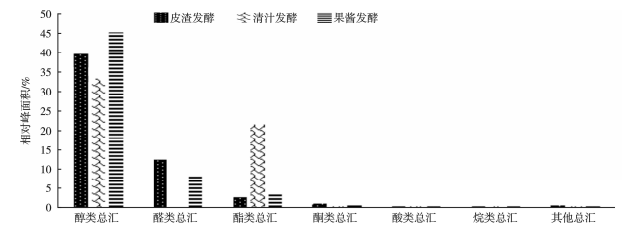 由圖4可知,3種發(fā)酵方式柿子酒的香氣成分大部分為醇類、酯類、醛類,醇類是柿子酒香氣的主要成分。皮渣發(fā)酵、清汁發(fā)酵、果漿發(fā)酵總醇類相對峰面積分別為39.62%、33.47%、45.32%,其中異戊醇相對峰面積最高,分別為32.03%、32.03%、29.32%。皮渣發(fā)酵、清汁發(fā)酵、果漿發(fā)酵總酯類相對峰面積分別為2.79%、21.65%、3.53%,其中丁二酸二乙酯相對峰面積最高,分別為1.18%、0.04%、1.39%。皮渣發(fā)酵、清汁發(fā)酵、果漿發(fā)酵總?cè)╊愊鄬Ψ迕娣e分別為12.56%、0.00%、7.97%,其中縮醛相對峰面積最高,分別為12.43%、0.00%、7.85%。酸類、烷類、酚類和其他類物質(zhì)含量較低,對酒的香氣起重要的修飾作用。清汁發(fā)酵柿子酒香氣成分中酯類數(shù)量最多,為27種,果漿發(fā)酵次之。清汁發(fā)酵的柿子酒香氣更濃郁,具有典型性。