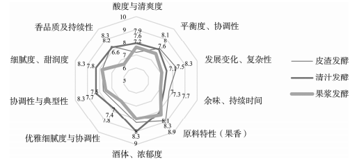 圖4 柿子酒中香氣物質(zhì)分類 不同發(fā)酵方式柿子酒的感官分析 由圖5可知,根據(jù)柿子果酒感官評分標(biāo)準(zhǔn),對3種發(fā)酵方式柿子酒進(jìn)行感官評價。研究發(fā)現(xiàn),清汁發(fā)酵柿子酒香氣得分與皮渣發(fā)酵比較接近,在柿子壓榨過程中香氣成分有所損失,與電子鼻檢測結(jié)果相同。清汁發(fā)酵柿子酒綜合感官評分大于果漿發(fā)酵和皮渣發(fā)酵柿子酒,與氣相-質(zhì)譜檢測到清汁發(fā)酵柿子酒香氣成分較多的結(jié)果相同。
