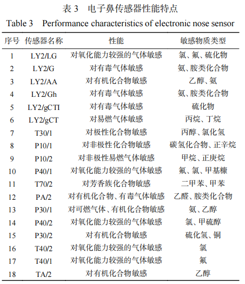 電子鼻分析 法國(guó)產(chǎn)電子鼻是通過MXT-5(弱極性)和MXT-7(中極性)色譜柱分離氣味物質(zhì),一共由18根金屬氧化傳感器組成,每根傳感器對(duì)應(yīng)一類或幾類物質(zhì)敏感,采用氫離子檢測(cè)器分析色譜信息,完成檢測(cè)后,即可使用儀器自帶數(shù)據(jù)庫(kù)對(duì)樣品揮發(fā)性物質(zhì)進(jìn)行定性、定量分析。電子鼻傳感器性能特點(diǎn)見表3。