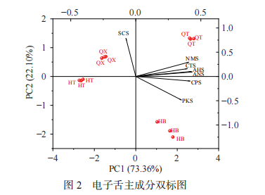 圖2顯示主成分PC1貢獻(xiàn)率為73.36%、PC2貢獻(xiàn)率為22.10%,表明主成分降維后數(shù)據(jù)能反映原數(shù)據(jù)的整體信息,四個(gè)樣品分布在四個(gè)象限中,無(wú)重疊,表明樣品之間存在較明顯差異性。主成分雙標(biāo)圖貢獻(xiàn)影響因子在圖中以線段表示,越靠近樣品所在坐標(biāo)軸,說(shuō)明影響因子對(duì)其影響越大。樣品HT最靠近X軸,且樣品HT與QX相近,滋味相似;樣品HB距離其他樣品較遠(yuǎn),位于第四象限,其滋味差異主要體現(xiàn)在PC1上;結(jié)果表明,電子舌能明顯區(qū)分四個(gè)部位樣品,且樣品之間滋味差異明顯。