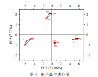 如圖4所示:四個(gè)部位樣品能夠獨(dú)立區(qū)分出來(lái),說(shuō)明電子鼻能夠辨別樣品氣味特征,且PC1貢獻(xiàn)率為87.06%、PC2貢獻(xiàn)率為7.77%,說(shuō)明大量有效信息存在于第一主成分??梢耘袛?,樣品HT、HB、QT氣味特征相近,樣品QX氣味特征與其他部位差異較大。