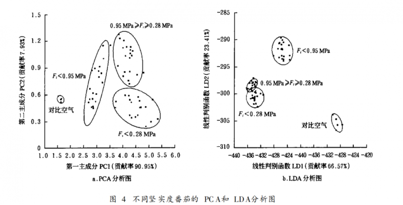 按堅(jiān)實(shí)度指標(biāo)對(duì)番茄成熟度進(jìn)行重新劃分,將番茄按堅(jiān)實(shí)度分為3個(gè)等級(jí): Fi > 0. 95 M Pa的為半熟期, 0. 95 M Pa≥ Fi≥ 0. 28 M Pa的為成熟期, Fi < 0. 28M Pa的為完熟期。圖4顯示了電子鼻的分析結(jié)果, PCA 分析的總的貢獻(xiàn)率為98. 88% , LDA分析的總的貢獻(xiàn)率為89. 98%。從中可以看出,電子鼻可以區(qū)別番茄的堅(jiān)實(shí)度差異,采用PCA方法分析時(shí),電子鼻可以100% 地區(qū)分不同成熟度的番茄。