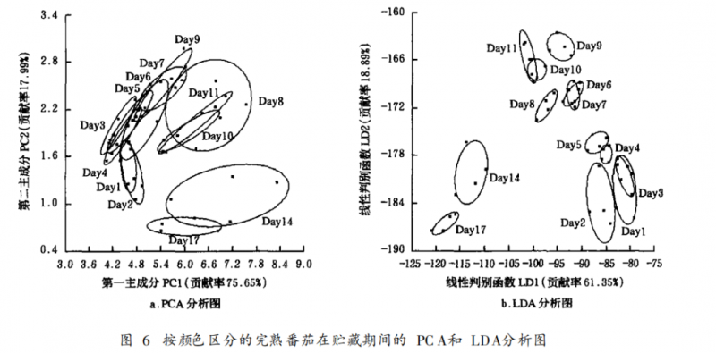 圖6為完熟番茄在貯藏中電子鼻檢測的PCA分析和LDA分析圖。從PCA分析圖中可知完熟期番茄氣味變化的趨勢(shì),但Day1~Day11之間變化沒有較明顯的分界, Day1~Day11與Day14~Day 17之間可以較好地進(jìn)行區(qū)分。采用PCA分析來區(qū)分完熟番茄的貯藏時(shí)間不理想。從LDA分析圖中可知,在Day 1~Day5中, 分布的區(qū)域比較接近;在Day 6~Day11中,分布的區(qū)域也比較接近且均位于分析圖的上方;從Day 1~Day 11的分布區(qū)域看, Day1~Day 5與Day6~Day 11之間的分部區(qū)域有明顯的差異; Day 1~Day 5、Day 6~Day 11、Day 14~Day 17之間可以較好地進(jìn)行區(qū)分。完熟期與成熟期番茄的電子鼻檢測分析差異可能與同一貯藏條件下完熟番茄比成熟番茄提早1 d進(jìn)入呼吸躍變有關(guān)。