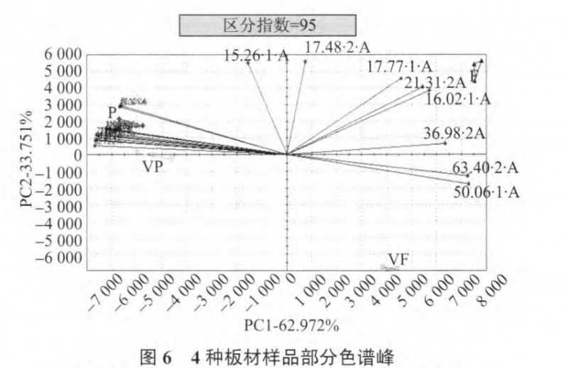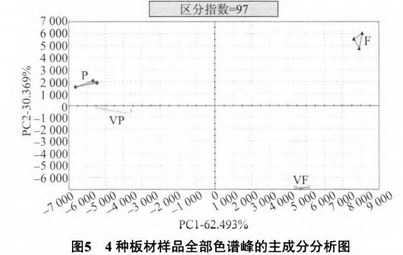 通過篩選峰面積較大(峰面積>l ooo)及樣品分較為明顯(區(qū)別能力>0.9)色譜峰優(yōu)化試驗結(jié)果見圖6,且標注出貢獻區(qū)分的主要色譜峰。圖5與圖6無明顯差異,4種樣品分布趨勢相同,刨花板與貼面刨花板距離較為接近,纖維板與貼面纖維板的距離較遠。