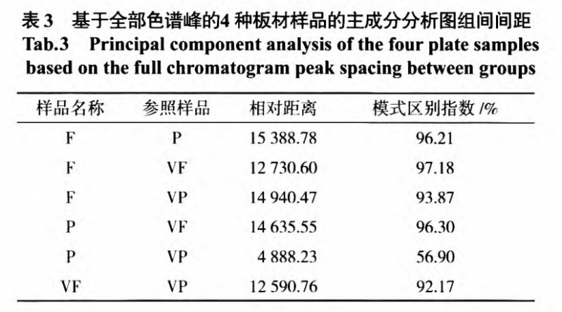 通過4種樣品的相對位置大致了解樣品的區(qū)別,橫縱坐標的數(shù)值只是相對位置。在4種板材樣品中,刨花板與貼面刨花板距離較近且明顯遠離其他兩種樣品,說明刨花板與貼面刨花板之問樣品差異較小,氣味較為接近,即刨花板貼面與否與氣味差別的大小關(guān)系相對較低。而對于纖維板和貼面纖維板樣品來說,二者相對距離較遠,不僅在種類上明顯區(qū)別于刨花板和貼面刨花板,而且可以看出是否貼面對于纖維板板材成品氣味的影響較大。