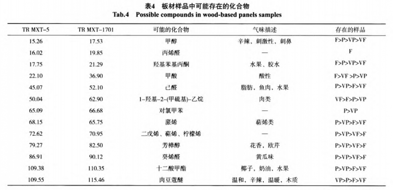 采用AroChembase數(shù)據(jù)庫對板材樣品中的揮發(fā)性化合物進行定性,可能含有的化合物見表4。