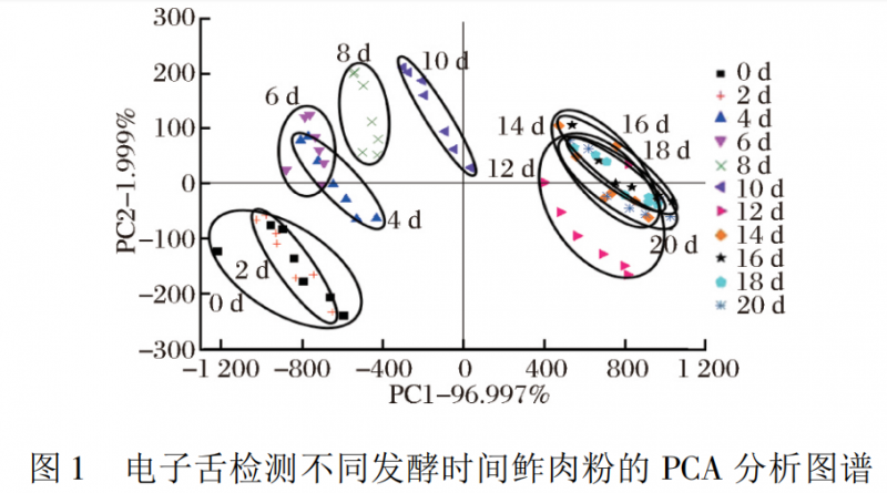 由圖 2 中 DFA 圖譜可知第一主成分貢獻率為93.243% ,第二主成分貢獻率為5. 817% ,2 種主要成分累積貢獻率為 99.06% ( 超過 85% ) ,說明 2 種主成分包括鲊肉粉滋味物質(zhì)的大部分信息。從 DFA 圖譜中看出,第 0 ~ 10 天,鲊肉粉發(fā)酵規(guī)律同 PCA 圖譜類似,但從第 12 ~ 16 天,鲊肉粉從左下方向右上方移動且小部分與第 18 天和第 20 天重疊,說明發(fā)酵中期隨時間的改變鲊肉粉的滋味物質(zhì)也有所改變且不同于發(fā)酵后期,從第 18 天和第 20 天樣品重疊在一起,說明發(fā)酵后期鲊肉粉產(chǎn)生的滋味物質(zhì)逐漸趨于穩(wěn)定。