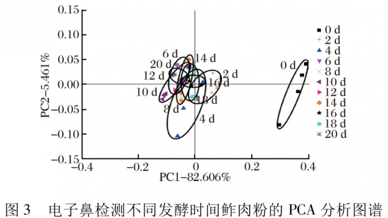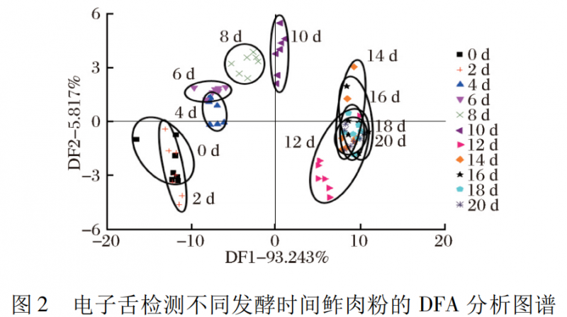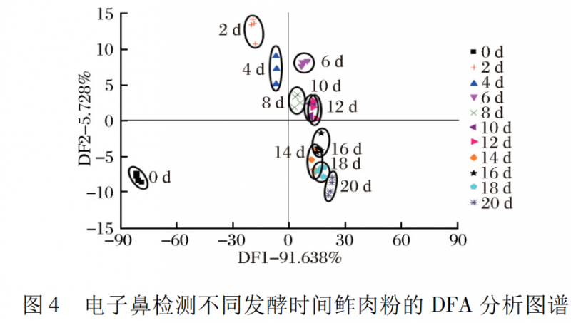 通過 PCA 和 DFA 分析得出,電子舌能有效地區(qū)分不同發(fā)酵時間鲊肉粉風味物質(zhì)的變化,并且 DFA 比 PCA 能更好地分辨出鲊肉粉風味的變化; 電子鼻能有效地分析出不同發(fā)酵時間鲊肉粉揮發(fā)性風味物質(zhì)的變化,特別是第 0 天顯著差異于其他發(fā)酵時間的鲊肉粉,其中 DFA 比 PCA 更好的分辨出鲊肉粉風味物質(zhì)的變化。
