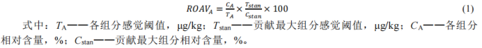 抓飯,市售;Asrree Ⅱ/LS16電子舌、HERACLES Ⅱ電子鼻,氣質(zhì)聯(lián)用儀。 樣品粉碎,稱(chēng)取1g樣品于20g樣品瓶中,迅速用專(zhuān)用瓶蓋壓蓋密封,電子鼻測(cè)定參數(shù):清洗時(shí)間120s,樣品準(zhǔn)備時(shí)間10s,測(cè)定時(shí)間120s,載氣流速150mL/min,每組樣品測(cè)定5次,取最后3次穩(wěn)定數(shù)據(jù)進(jìn)行分析。 稱(chēng)取7.5g樣品定容至120mL,振蕩混勻,常溫振蕩孵育30min,4000r/min離心15min,上清液過(guò)濾后上機(jī)測(cè)定。數(shù)據(jù)采集前,對(duì)電子舌進(jìn)行傳感器活化、校準(zhǔn)等操作,確保檢測(cè)數(shù)據(jù)的可靠性與穩(wěn)定性。將100mL濾液置于電子舌專(zhuān)用容器中,樣品采集與清洗交替進(jìn)行每?jī)蓚€(gè)樣品間放1杯100mL的蒸餾水,清洗10s,樣品采集時(shí)間120s,重復(fù)7次,取后4次試驗(yàn)數(shù)據(jù)。 采用頂空固相微萃取法進(jìn)行樣品處理,稱(chēng)取2g樣品,放入20mL帶有硅膠墊帽的頂空萃取瓶中,立即密封,萃取溫度60℃,平衡15min,頂空吸附45min。250℃解析5min。 利用ROAV定義對(duì)樣品風(fēng)味貢獻(xiàn)最大的揮發(fā)性風(fēng)味物質(zhì),即ROAVmax=100,其它揮發(fā)性成分ROAV按式(1)計(jì)算。