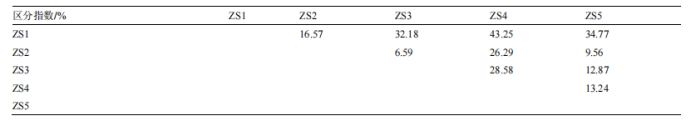 圖2 電子舌檢測(cè)不同抓飯的PCA和DFA分析圖譜 表1是5個(gè)不同品種抓飯電子舌區(qū)別指數(shù)分析,ZS2、ZS3、ZS5區(qū)別指數(shù)分別為6.59,9.56,12.87,距離值最小,可知三者味覺(jué)的相似性較大。ZS1和ZS4的距離值最大43.25,可知兩者的相似性最小。