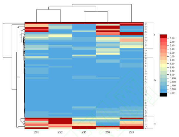 圖5 抓飯揮發(fā)性成分PCA雙標(biāo)圖 圖6為抓飯主要揮發(fā)性化合物聚類(lèi)熱圖。通過(guò)顏色變化可直觀看出各抓飯揮發(fā)性風(fēng)味組分間存在差異;通過(guò)化合物聚類(lèi)結(jié)果可知,化合物相對(duì)含量相似組分大多聚為一類(lèi),顏色變化趨勢(shì)基本一致;從上方的聚類(lèi)來(lái)看,所有的樣品大致可以分為3類(lèi):主要體現(xiàn)在a、b、c3個(gè)區(qū)域內(nèi)揮發(fā)性化合物相對(duì)含量的變化;聚類(lèi)熱圖在主成分分析和相關(guān)性分析上均有較高的響應(yīng)。