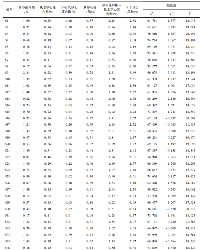 表4 穿心蓮粉末色度值與4個(gè)二萜內(nèi)酯類成分含量的相關(guān)性分析