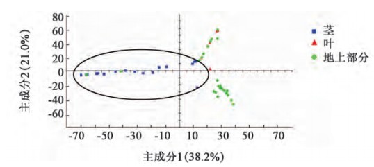 將所得數(shù)據(jù)用AlphaSoft軟件進(jìn)行PCA,見(jiàn)圖2。結(jié)果發(fā)現(xiàn)主成分1(PC1)與主成分2(PC2)的累計(jì)R2=59.2%,說(shuō)明模型的PC1與PC2體現(xiàn)了樣品絕大部分的變量信息,所收集的50批穿心蓮樣品較為清楚地分為2部分,穿心蓮的莖大多數(shù)在縱軸的左邊,除了樣品莖S7,S29,S41,S49,S50分布在縱軸右側(cè),但是這幾個(gè)樣品離縱軸左側(cè)最近。而縱軸右側(cè)主要為葉和地上部分,其中樣品葉S9~S13均分布在縱軸右側(cè)上方。