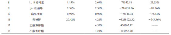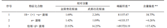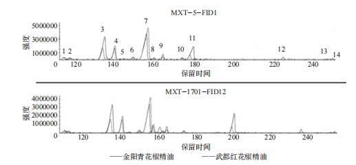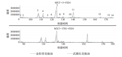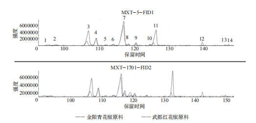 花椒作物在我國很多地區(qū)都有種植,花椒的揮發(fā)油是花椒香氣的主要來源,也是反映花椒香氣的主要指標(biāo),花椒中揮發(fā)油的含量及組成成分不僅受到花椒品種、產(chǎn)地環(huán)境因子(如產(chǎn)地氣候、雨量、日照時(shí)間、土質(zhì)等)的影響,還受到提取加工方法、提取部位和采收時(shí)期等外在因素的影響。 超快速氣相電子鼻技術(shù)具有分析速度快、靈敏度高和檢測(cè)費(fèi)用低等優(yōu)點(diǎn)。超快速氣相電子鼻將雙快速氣相色譜檢測(cè)與基于多變量統(tǒng)計(jì)的強(qiáng)大數(shù)據(jù)處理和感官及化學(xué)表征(Arochembase)的可選模塊相結(jié)合,利用超快速氣相電子鼻技術(shù),解析不同品種花椒及花椒提取物揮發(fā)性化合物,通過主成分分析建立產(chǎn)品有效判別模型,同時(shí)解析花椒物質(zhì)構(gòu)成。 不同產(chǎn)地花椒原料、花椒精油產(chǎn)品、花椒油產(chǎn)品、nC6-nC16標(biāo)準(zhǔn)溶液。 超快速氣相電子鼻;零空氣發(fā)生器;氫氣發(fā)生器;20mL頂空進(jìn)樣瓶,電子天平。 花椒:取0.2g花椒顆粒于20mL頂空進(jìn)樣瓶中,迅速加蓋密封檢測(cè),設(shè)置3個(gè)平行樣品,降低檢測(cè)誤差。 花椒精油:將花椒精油搖晃均勻后,取20uL于20mL頂空進(jìn)樣瓶中,加蓋密封檢測(cè),每個(gè)樣品設(shè)置3個(gè)平行樣。 花椒油:將花椒油搖晃均勻后,使用電子天平稱取0.1g于20mL頂空進(jìn)樣瓶中,加蓋密封檢測(cè),設(shè)置3個(gè)平行樣品。 花椒原料:樣品量0.2g,進(jìn)樣體積500uL,孵化溫度80℃,孵化時(shí)間20min,50℃恒溫30s,1℃/s速率升溫至80℃恒溫30s,3℃/s速率升溫至125℃恒溫10s,3℃/s速率升溫至250℃恒溫11s。 花椒精油:取樣量100μL,捕集溫度40℃,孵化溫度60℃,孵化時(shí)間10min,載氣流量30mL/min;進(jìn)樣量1000uL,進(jìn)樣口溫度200℃,閥溫度為250℃;FID溫度260℃,升溫程序:初始溫度45℃,保持35s,1.0℃/s升至70℃,保持30s,0.5℃/s升至140℃,3.0℃/s升至250℃,保持21s,采集時(shí)間共計(jì)288s。花椒油:取樣量0.1g,捕集溫度40℃,孵化溫度60℃,孵化時(shí)間20min,載氣流量30mL/min;進(jìn)樣量500uL,進(jìn)樣口溫度200℃,閥溫度為260℃,F(xiàn)ID溫度為260℃,升溫程序:初始溫度50℃,保持30s,1.0℃/s升至85℃,保持30s,1.0℃/s升至125℃,保持10s,3.0℃/s升至250℃,保持10s,采集時(shí)間共計(jì)197s。 將裝有樣品的頂空小瓶按照順序依次放入樣品盤,每3個(gè)平行樣品后面放入一個(gè)空瓶,目的是為了消除樣品帶來的信號(hào)干擾,選擇程序進(jìn)行樣品分析。 使用Heracles超快速氣相電子鼻自帶軟件Alphasoft進(jìn)行樣品數(shù)據(jù)處理,明確揮發(fā)性風(fēng)味物質(zhì)種類與含量。 利用正構(gòu)烷烴標(biāo)準(zhǔn)溶液(nC6-nC16)進(jìn)行校準(zhǔn),進(jìn)行保留時(shí)間與保留參數(shù)之間的轉(zhuǎn)換,利用超快速氣相電子鼻自帶數(shù)據(jù)庫AroChembase數(shù)據(jù)庫對(duì)樣品中的成分進(jìn)行定性分析,采用峰面積歸一法對(duì)目標(biāo)化合物進(jìn)行定量分析,確定各香氣成分相對(duì)含量。 采用正構(gòu)烷烴標(biāo)準(zhǔn)溶液(nC6-nC16)對(duì)檢測(cè)方法進(jìn)行校準(zhǔn),結(jié)合超快速氣相電子鼻自帶AroChembase數(shù)據(jù)庫對(duì)樣品中主要揮發(fā)性成分進(jìn)行定性分析,推測(cè)得到匹配度高的化合物。 通過對(duì)比色譜圖(圖1)發(fā)現(xiàn),樣品間的出峰時(shí)間及出峰位置基本一致,峰面積間存在差異,說明樣品中揮發(fā)性成分的種類基本一致,含量上存在略微差異。 青花椒原料中共分析出11種含量較高成分,紅花椒原料中共分析出13種含量較高成分,乙酸芳樟酯與乙酸香葉酯在青花椒中未曾檢測(cè)出。通過計(jì)算,可知青、紅花椒不僅成分種類上有差異,各成分含量上同樣差異明顯。除1R-(+)-α-蒎烯、1,8桉葉素、乙酸芳樟酯、乙酸香葉酯外,其他成分均是青花椒中含量較紅花椒高。其中,青紅花椒原料中芳樟醇含量差別最大,差異最為明顯,D-檸檬烯含量差別較大,但相對(duì)偏差不大,推斷不是造成青紅花椒風(fēng)味不同的主要差異。乙酸芳樟酯、乙酸香葉酯僅存在于紅花椒原料中,由此可利用花椒原料產(chǎn)品中芳樟醇、乙酸芳樟酯、乙酸香葉酯含量區(qū)分花椒原料種類。 表1 武都紅花椒、金陽青花椒原料特征化合物相對(duì)含量與峰面積差異 青花椒精油中共分析出11種含量較高成分,紅花椒精油中共分析出13種含量較高成分,乙酸芳樟酯與乙酸香葉酯在青花椒中未曾檢測(cè)出,與原料表現(xiàn)一致。通過計(jì)算峰面積差值和含量偏差可知,乙酸芳樟酯等酯類物質(zhì)僅存在于紅花椒中。1R-(+)-α-蒎烯、月桂烯、D-檸檬烯、1,8桉葉素在紅花椒精油中含量較高,其他組分在青花椒精油中含量較高,和原料情況不一致,可能和提取工藝有關(guān)。其中芳樟醇含量差別最大,差異最為明顯,乙酸芳樟酯、乙酸香葉酯僅存在于紅花椒精油產(chǎn)品中,由此可利用花椒精油產(chǎn)品中檜烯、β-蒎烯、芳樟醇含量和乙酸芳樟酯、乙酸香葉酯等酯類物質(zhì)存在與否來區(qū)分花椒精油種類。 表2 武都紅花椒精油、金陽青花椒精油特征化合物相對(duì)含量與峰面積差異