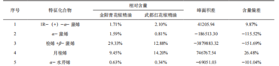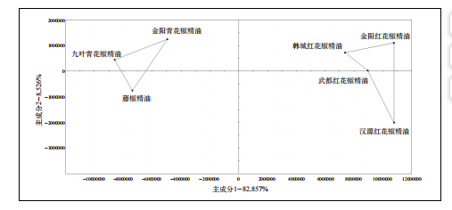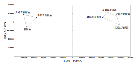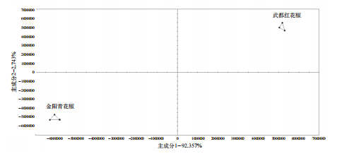 青花椒油中共分析出11種含量較高成分,紅花椒油中共分析出13種含量較高成分,乙酸芳樟酯與乙酸香葉酯在青花椒油中未曾檢測(cè)出。 通過計(jì)算峰面積差值和含量偏差可知,乙酸芳樟酯等酯類物質(zhì)僅存在于紅花椒油中,與精油情況一致,青紅花椒油中芳樟醇含量差別最大,差異最為明顯,乙酸芳樟酯僅存在于紅花椒原料中,由此可利用花椒精油產(chǎn)品中檜烯、β-蒎烯、芳樟醇含量和乙酸芳樟酯、乙酸香葉酯等酯類物質(zhì)存在與否來區(qū)分花椒精油種類。對(duì)青紅花椒原料及花椒提取物進(jìn)行指紋圖譜與物質(zhì)定性分析,青紅花椒在成分種類上有差異,紅花椒成分較青花椒復(fù)雜,主要體現(xiàn)在乙酸芳樟酯、乙酸香葉酯等酯類和醛類物質(zhì)上;青紅花椒各成分相對(duì)含量上差異明顯,其中芳樟醇、檜烯差異最為明顯,D-檸檬烯含量差別大,但差異貢獻(xiàn)度不大;芳樟醇、乙酸芳樟酯等成分可用來鑒別青紅花椒產(chǎn)品類別,且電子鼻分析速度快,可大大節(jié)約成本。 表3 武都紅花椒油、金陽青花椒油特征化合物相對(duì)含量與峰面積差異 主成分分析(PCA)是一種常見的多元統(tǒng)計(jì)方法,主要通過將采集的多指標(biāo)進(jìn)行數(shù)據(jù)轉(zhuǎn)換與降維,使用線性分類處理降維的特征向量,盡可能捕集數(shù)據(jù)集間最大差異,從整體層面上直觀地展示樣品分布。對(duì)花椒原料、花椒精油、花椒油進(jìn)行主成分分析,由圖4原料主成分分析可以看出,兩種花椒原料之間存在顯著差異,現(xiàn)有數(shù)據(jù)可對(duì)未知產(chǎn)地的原料進(jìn)行產(chǎn)地區(qū)分,前提是原料來自兩個(gè)產(chǎn)地。后續(xù)可收集其余產(chǎn)地花椒原料,積累大量數(shù)據(jù),建立原料質(zhì)量標(biāo)準(zhǔn),對(duì)實(shí)際應(yīng)用中采購、生產(chǎn)、銷售提供指導(dǎo)性建議。 對(duì)6類花椒精油樣品進(jìn)行PCA分析,結(jié)果如圖5所示,PC1與PC2相加大于91.38%,代表被檢測(cè)樣品中絕大部分信息,說明實(shí)驗(yàn)的花椒精油樣品成分存在差異,呈現(xiàn)不同類型風(fēng)味,主成分分析能對(duì)不同種類花椒精油進(jìn)行識(shí)別與區(qū)分。 對(duì)四類花椒油樣品進(jìn)行PCA分析,結(jié)果如圖6所示,PC1方差貢獻(xiàn)率為89.896%,PC2的方差貢獻(xiàn)率為0.953%,兩者累計(jì)方差為90.849%,主成分顯示樣品中絕大部分信息,說明實(shí)驗(yàn)的花椒油樣品成分存在差異,呈現(xiàn)不同類型風(fēng)味,主成分分析能對(duì)不同種類花椒油進(jìn)行識(shí)別與區(qū)分。 利用超快速氣相電子鼻技術(shù),解析不同產(chǎn)地花椒及花椒提取物指紋圖譜,明確花椒及花椒提取物揮發(fā)性風(fēng)味物質(zhì),芳樟醇、乙酸芳樟酯等成分可用來鑒別青紅花椒產(chǎn)品類別,且電子鼻分析速度快,可大大節(jié)約成本,利用超快速氣相電子鼻技術(shù)可識(shí)別花椒中的關(guān)鍵香氣成分,為花椒品種篩選、產(chǎn)地識(shí)別和深加工提供理論依據(jù)。