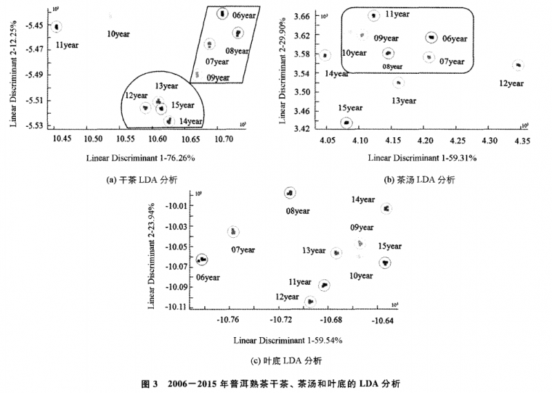 由 LDA判別因子分析圖(圖 3)可知,10個不同年份普洱熟茶干茶 (圖 3a)的LinearDiscriminant1和LinearDiscriminant2的貢獻率分別達到 76.26% 和 12.25% ,兩判別式的總貢獻率為 88.51%,相互之問都能明顯的區(qū)分,香氣的數(shù)據(jù) 采集點有不同的分布區(qū)域。其中 ,2010年和 2011年茶樣相互之間的距離較遠(yuǎn),2006—2009年的 4個茶樣分布在距離較近的同一區(qū)域,2012~2015年 4個茶樣也 同樣分布在距離較近的同一區(qū)域,且兩區(qū)域相互間距離較近,但兩區(qū)域距離 2010年和 2011年的區(qū)域較遠(yuǎn),且 2013年 和 2015年存在重疊現(xiàn)象,說明儲藏年份相近 的普洱熟茶干茶中可能含有共同的香氣物質(zhì),同時也說明隨著儲藏年份的增加香氣成分會產(chǎn)生明顯的變化,也說明 LDA法可以區(qū)分不同儲藏年份的普洱熟茶,與 PCA 的分析結(jié)果相互驗證 。茶湯 (圖 3b)的 LinearDiscriminant1的貢獻率達到 59.3l% ,LinearDiscriminant2的貢獻率達到 29.90%,兩判別式的總貢獻率為 89.21% 。從圖 3b可以看出,除 2012年和 2015年的茶湯香氣數(shù)據(jù)采集點相互之問的距離較遠(yuǎn)外,其余的幾個集中分布在離 Y=0最遠(yuǎn)的區(qū)域 ,且各個茶樣都沒有存在重 疊現(xiàn)象,說明茶湯的香氣存在差異,且區(qū)分效果比干茶好葉底 (圖 3c)的LinearDiscriminant1和 LinearDiscriminant2的貢獻率分別達到 59.54% 和 23.94% ,兩判別式的總貢獻率為83.48% ,相互之間都能明顯的區(qū)分,香氣的數(shù)據(jù)采集點有不同的分布區(qū)域,且儲藏年份相近的茶樣分布在同一區(qū)域,說明儲藏年份 相近的普洱熟茶葉底中可能含有共同的香氣物質(zhì),同時也說明隨著儲藏年份的增加 香氣成分會產(chǎn)生明顯的變化。綜上所述,無 論是PCA 分析還是 LDA分析,都能將 普洱熟茶香氣較好地區(qū)分開,且 PCA 分析結(jié)果明顯優(yōu)于 LDA 分析結(jié)果,而且年份 差別越大,分離效果越好。